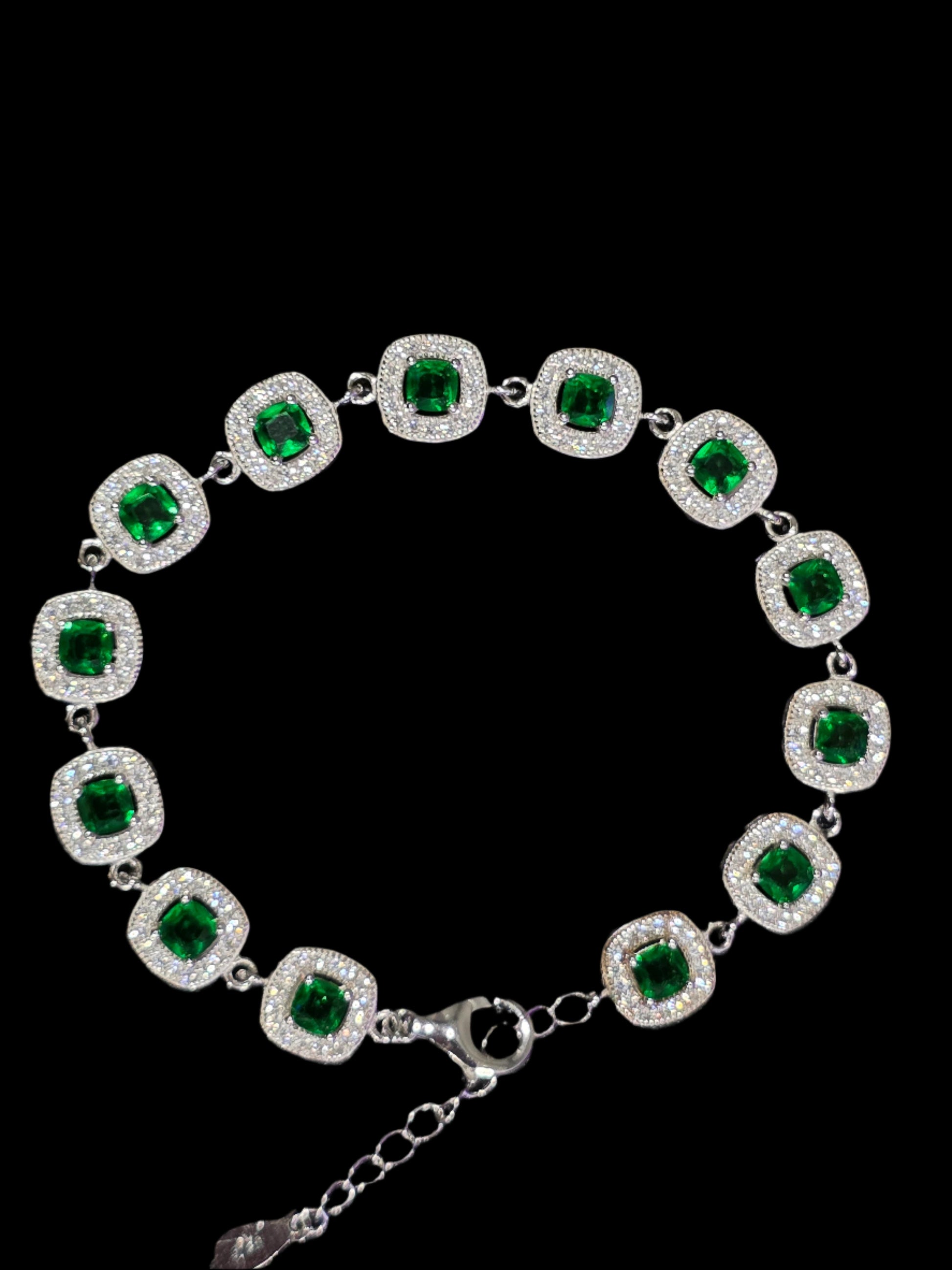 Make a statement with this Stunning Silver Bracelet, designed to captivate with its vivid green cubic zirconia stones, each encircled by a halo of brilliant clear CZ accents. Set in high-quality silver, this bracelet combines the luxurious look of fine gemstones with the durability and affordability of modern materials.