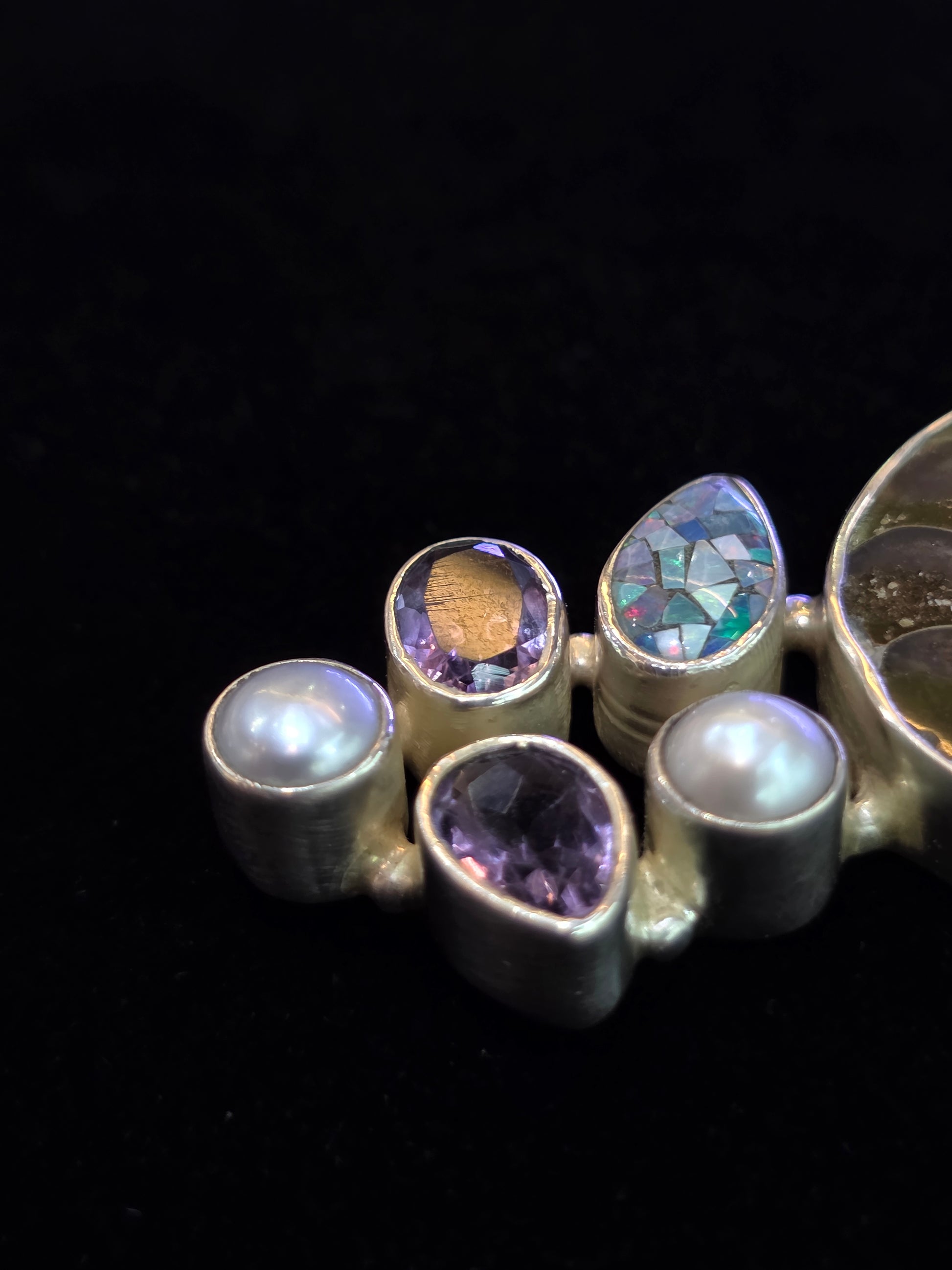 • Two amethyst gemstones, one oval and one teardrop-shaped, provide a pop of royal purple color.