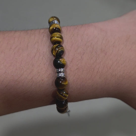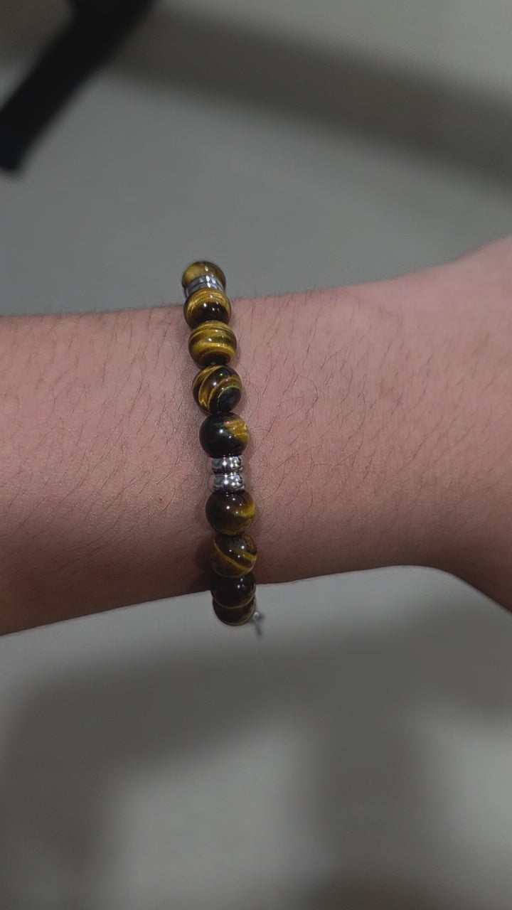 Elevate your style with this handcrafted Tiger Eye beaded bracelet, designed for both elegance and strength. Featuring natural Tiger Eye stones in rich golden-brown tones, each bead showcases unique patterns and a polished finish that reflects light beautifully. Silver-tone spacers add a modern touch, while the stainless steel lobster clasp and adjustable chain ensure a secure and comfortable fit for all wrist sizes.