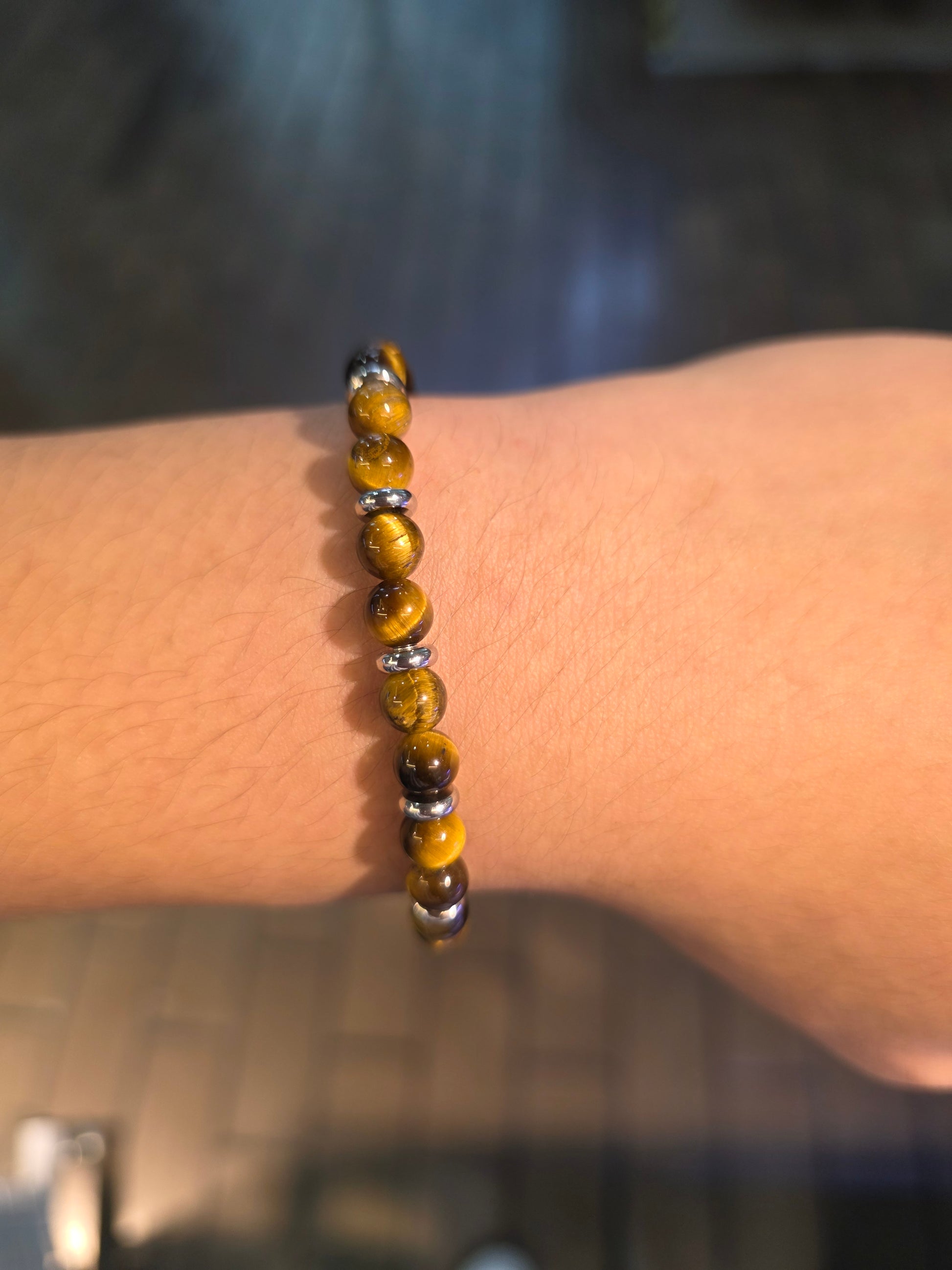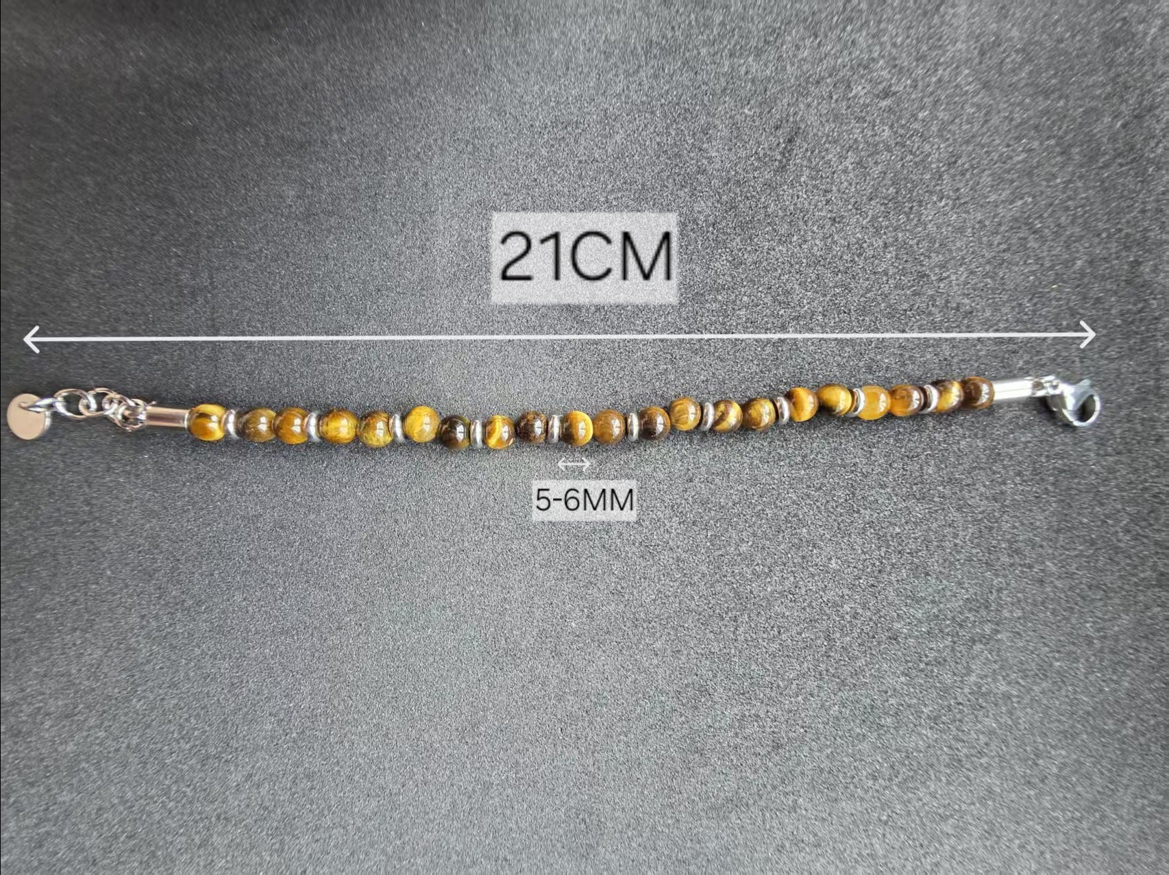 Elevate your style with this handcrafted Tiger Eye beaded bracelet, designed for both elegance and strength. Featuring natural Tiger Eye stones in rich golden-brown tones, each bead showcases unique patterns and a polished finish that reflects light beautifully. Silver-tone spacers add a modern touch, while the stainless steel lobster clasp and adjustable chain ensure a secure and comfortable fit for all wrist sizes.